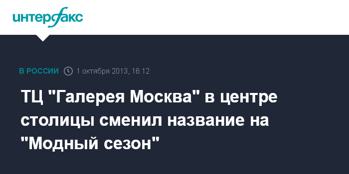 Москва. 1 октября. INTERFAX.RU - ТЦ "Галерея Москва", расположенный по адресу Охотный Ряд, 2, сменил название. Как сообщает пресс-служба центра, теперь он будет называться торговая галерея "Модный Сезон".