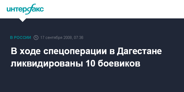 Махачкала. 17 сентября. ИНТЕРФАКС - В Дагестане ликвидированы десять боевиков в ходе контртеррористической спецоперации, сообщили "Интерфаксу" источники в правоохранительных органах республики.
