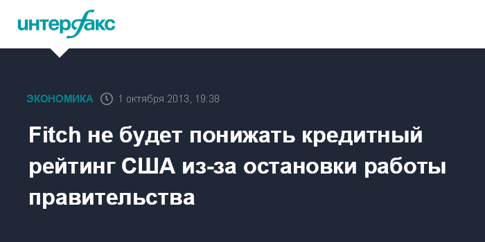 Нью-Йорк. 1 октября. INTERFAX.RU - Приостановка работы правительства США сама по себе не спровоцирует понижение суверенного рейтинга ("AAA/негативный"), говорится в пресс-релизе рейтингового агентства Fitch. Тем не менее этот фактор подрывает доверие к процессу одобрения бюджета. Кроме того, очень важно своевременно повысить потолок госдолга США, чтобы избежать риска дефолта по гособлигациям.