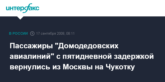 Анадырь. 17 сентября. INTERFAX.RU - Пассажиры рейса ОАО "Домодедовские авиалинии" (входит в состав альянса "Air Union") после задержек вылета из Москвы, продолжавшихся пять дней, прибыли в аэропорт Анадыря.