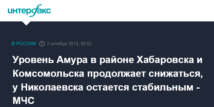 Хабаровск. 2 октября. ИНТЕРФАКС-ДАЛЬНИЙ ВОСТОК - Вода в реке Амур в черте Хабаровска по данным на 08:00 местного времени (01:00 мск) упала на 8 см, уровень реки составляет 437 см, сообщает пресс-служба ГУ МЧС по региону в среду.