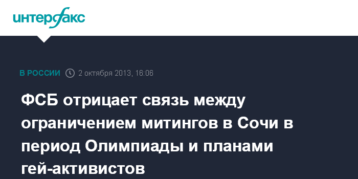Москва. 2 октября. INTERFAX.RU - Ограничение на проведение митингов и акций в Сочи во время зимней Олимпиады не нарушает законодательства и никак не связано с намерением гей-активистов провести свои акции, заявили в ФСБ.