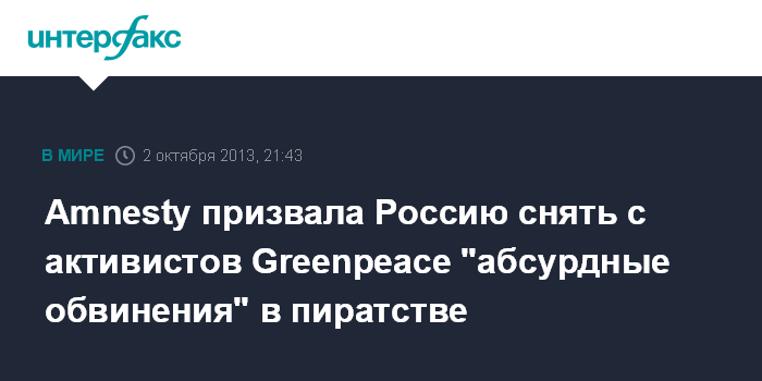 "Обвинения в пиратстве, выдвинутые сегодня в России против активистов международной природоохранной организации Greenpeace, абсурдны, наносят ущерб верховенству права и должны быть немедленно сняты", - говорится в заявлении Amnesty International.