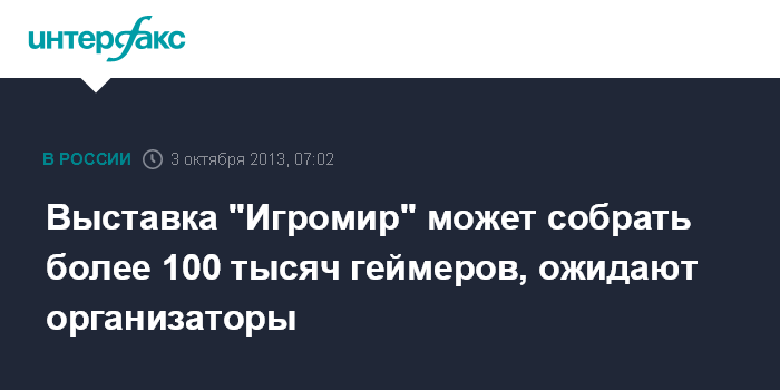 "3-6 октября в выставочном комплексе "Крокус Экспо" пройдет уже восьмой по счету "Игромир". В этом году мероприятие побьет собственный рекорд 2012 года - по предварительным оценкам, выставку посетят более 130 тысяч человек за четыре дня работы", - сообщила "Интерфаксу" пресс-секретарь выставки Анастасия Муравьева.