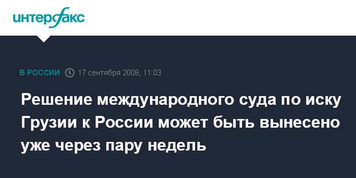 Москва. 17 сентября. INTERFAX.RU - Международный суд в Гааге может до конца этого месяца вынести решение по иску Грузии к РФ о дискриминации грузин по национальному признаку.