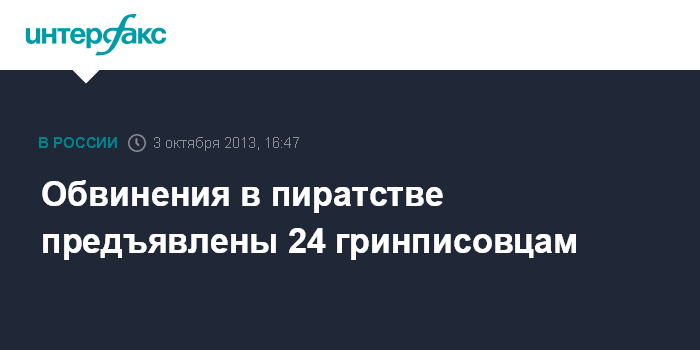 Москва. 3 октября. INTERFAX.RU - Уже 24 участника команды судна Greenpeace Arctic Sunrise обвинены в Мурманске в пиратстве, сообщили экологи.