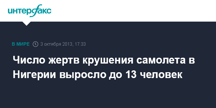 Йоханнесбург. 3 октября. INTERFAX.RU - Число погибших в результате крушения небольшого пассажирского самолета в четверг в Нигерии увеличилось до 13 человек, сообщили в министерства авиации страны.