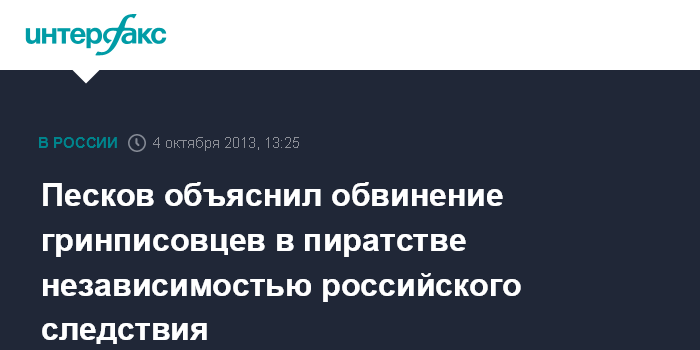 Песков объяснил обвинение гринписовцев в пиратстве независимостью российского следствия