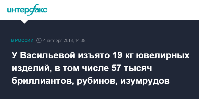 Москва. 4 октября. INTERFAX.RU - У ключевого фигуранта уголовного дела о хищениях в "Оборонсервисе", бывшей главы департамента имущественных отношений Минобороны Евгении Васильевой, было изъято, а впоследствии арестовано судом 19 кг различных ювелирных изделий.