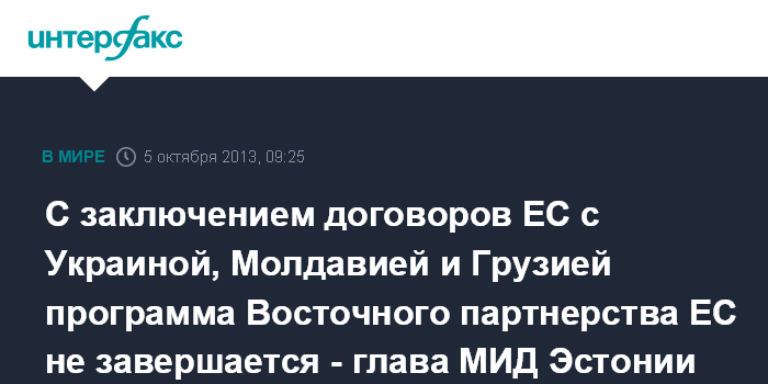 Таллин. 5 октября. ИНТЕРФАКС - Министр иностранных дел Эстонии Урмас Паэт (Urmas Paet) заявил, что с предстоящим в ноябре в Вильнюсе подписанием договора об ассоциации и свободной торговле ЕС-Украина и парафированием аналогичных договоров с Молдавией и Грузией программа Восточного партнерства ЕС не завершается.