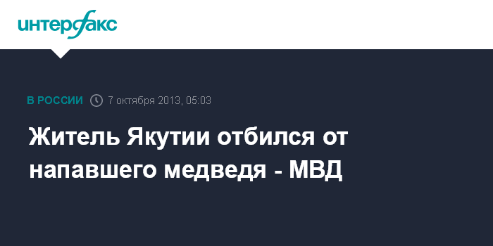 Якутск. 7 октября. ИНТЕРФАКС - ДАЛЬНИЙ ВОСТОК - Житель якутского села попал в больницу после нападения медведя.