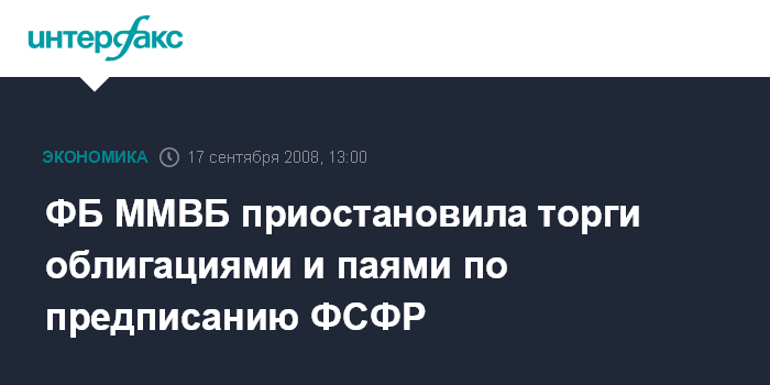 Москва. 17 сентября. INTERFAX.RU - ФБ ММВБ приостановила торги облигациями и паями с 12:51 мск по предписанию Федеральной службы по финансовым рынкам (ФСФР). Данное предписание последовало после того, как все секторы финансового рынка РФ продолжили падение на фоне обострившихся проблем с ликвидностью и начавшейся цепочки неплатежей по финансовым операциям, в частности, РЕПО.