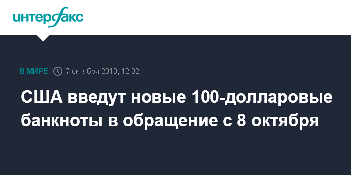 Вашингтон. 7 октября. INTERFAX.RU - Новая купюра достоинством $100 начнет обращение в США с 8 октября 2013 года - с задержкой более чем на 2,5 года из-за технических проблем, пишет The New York Times.