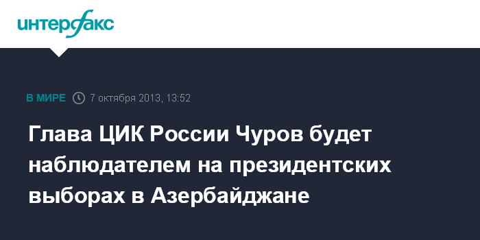 Москва. 7 октября. INTERFAX.RU - Глава ЦИК России Владимир Чуров примет участие в международном наблюдении за президентскими выборами в Азербайджане.