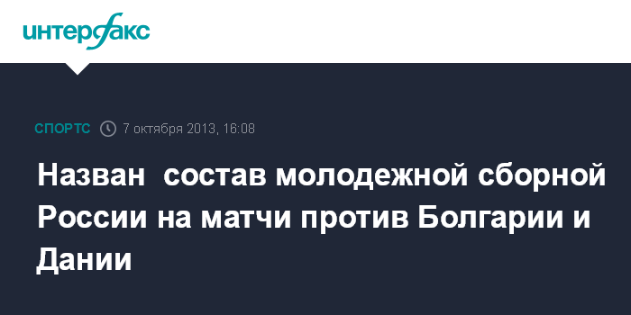 Москва. 7 октября. INTERFAX.RU - Стал известен состав молодежной сборной России на отборочные матчи чемпионата Европы-2015 с Болгарией и Данией, сообщается официальный сайт Российского футбольного союза.