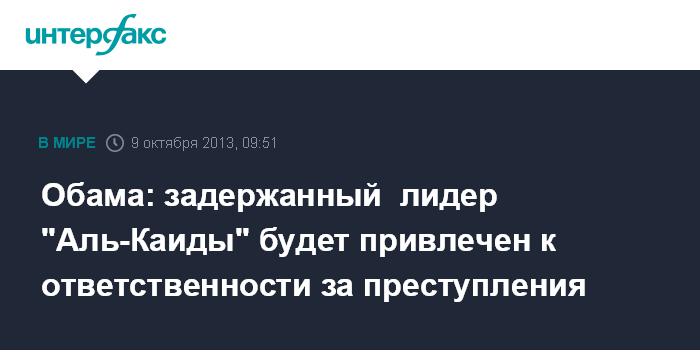 Вашингтон. 9 октября. INTERFAX.RU - Президент США Барак Обама заявил, что удерживаемый американскими военными главарь "Аль-Каиды" Абу Анас аль-Либи будет привлечен к ответственности за преступления, жертвами которых стали сотни людей.