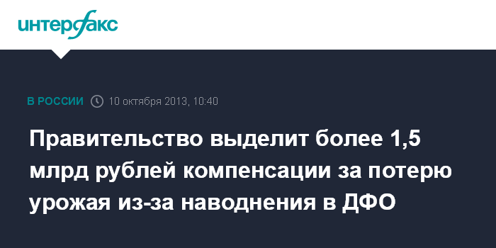 Москва. 10 октября. INTERFAX.RU - Правительство РФ поручило Минсельхозу выделить из Резервного фонда 1 млрд 678,129 тыс. рублей для выплаты компенсаций гражданам, чьи личные подсобные хозяйства пострадали от наводнения.