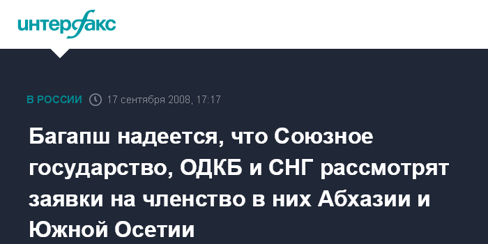 Москва. 17 сентября. INTERFAX.RU - Абхазия и Южная Осетия намерены подать заявку на членство в СНГ, Союзном государстве и ОДКБ. "Надеюсь, что эти структуры рассмотрят наши заявки. Считаю, что наше пребывание и в СНГ, и в Союзном государстве, и в ОДКБ - это то, что ставит жизнь перед нами", - сказал президент Абхазии Сергей Багапш на пресс-конференции в Москве.
