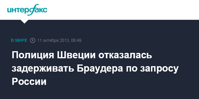 Москва. 11 октября. INTERFAX.RU - Правоохранительные органы Швеции отказались задерживать на территории страны объявленного Россией в международный розыск главу Hermitage Capital Уильяма Браудера, утверждают в пресс-службе компании.