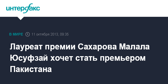 Нью-Йорк. 11 октября. INTERFAX.RU - Юная пакистанская активистка борьбы за права женщин Малала Юсуфзай заявила в Нью-Йорке, что хотела бы возглавить правительство Пакистана, чтобы "спасти страну".