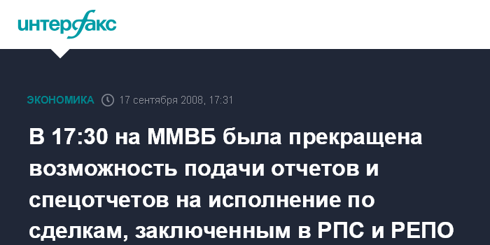 Москва. 17 сентября. INTERFAX.RU - ФБ ММВБ в 17:30 мск прекратила возможность подачи отчетов и специальных отчетов на исполнение по сделкам, заключенным в режиме переговорных сделок (РПС) и РЕПО, говорится в сообщении биржи.