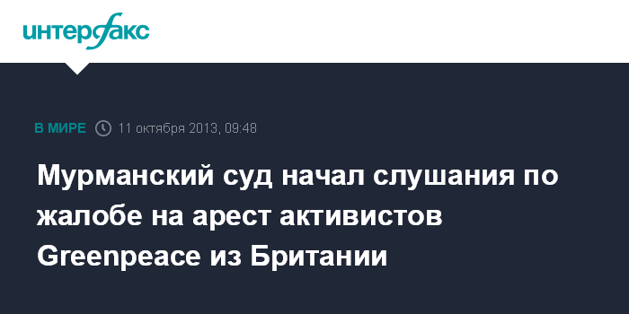 Мурманск. 11 октября. INTERFAX.RU - В здании Мурманского областного суда начались слушания по апелляционным жалобам на двухмесячный арест для двух подданных Великобритании, участвовавших в акции Greenpeace у "Приразломной".