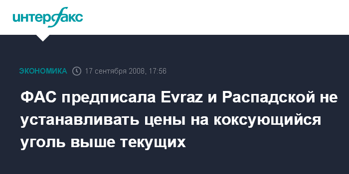 Москва. 17 сентября. INTERFAX.RU - Комиссия Федеральной антимонопольной службы (ФАС), в среду рассматривавшая условия предписания ООО "Евраз Холдинг" и ООО "Распадский уголь", обязала компании до 1 января 2009 г. не устанавливать цен на коксующийся уголь выше текущих, сообщил "Интерфаксу" начальник профильного управления ФАС Алексей Ульянов.