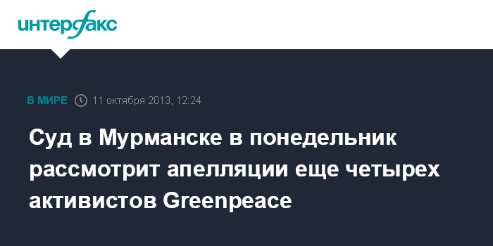 Мурманск. 11 октября. INTERFAX.RU - Мурманский областной суд в понедельник рассмотрит апелляционные жалобы четырех иностранных активистов Greenpeace, сообщила "Интерфаксу" пресс-секретарь суда Елена Синица.