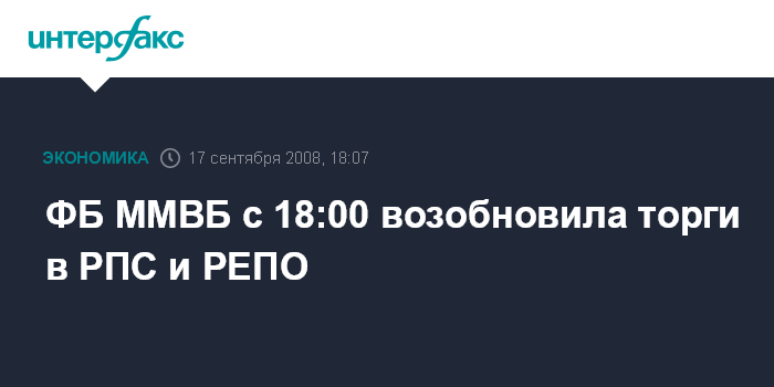 Москва. 17 сентября. INTERFAX.RU - ФБ ММВБ возобновила торги в режиме переговорных сделок (РПС) и РЕПО с 18:00 мск, они закончатся в 18:30 мск, говорится в сообщении биржи.