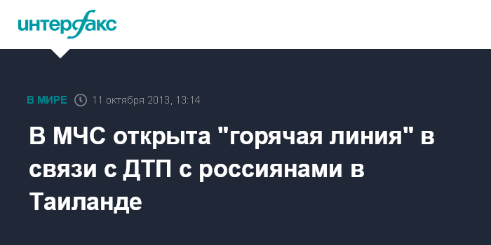 Москва. 11 октября. INTERFAX.RU - МЧС России открыло телефон "горячей линии" в связи с ДТП в Таиланде, в котором пострадали российские туристы, сообщила "Интерфаксу" официальный представитель министерства Ирина Россиус.