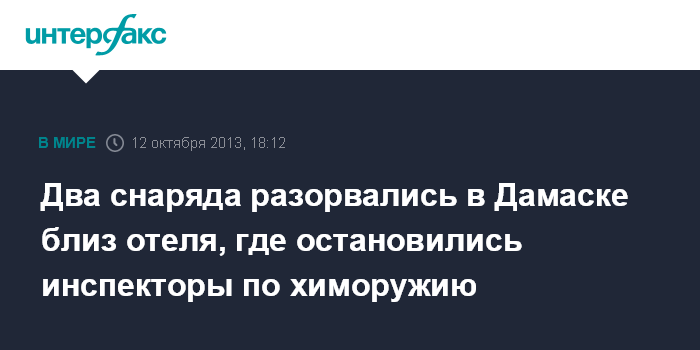Каир. 12 октября. INTERFAX.RU - В районе Абу Руманех в столице Сирии Дамаске разорвались два артиллерийских снаряда, сообщают в субботу сирийские государственные СМИ.