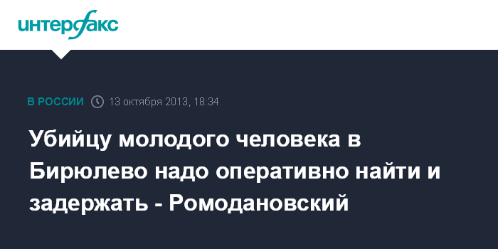 Москва. 13 октября. INTERFAX.RU - Человек, который убил жителя Бирюлево-Западное, должен быть как можно быстрее привлечен к ответственности, заявил "Интерфаксу" в воскресенье руководитель Федеральной миграционной службы Константин Ромодановский.