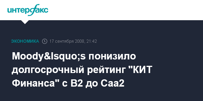 Одновременно агентство Moody‘s Interfax понизило национальный рейтинг "КИТ Финанса" с "A3.ru" до "B2.ru".