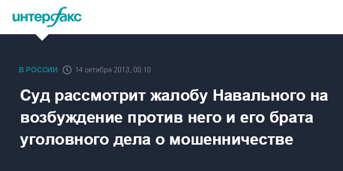 Москва. 14 октября. INTERFAX.RU - Мосгорсуд в понедельник рассмотрит жалобу оппозиционера Алексея Навального на возбуждение уголовного дела против него и его брата Олега, связанного с компанией "Ив Роше Восток".