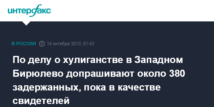 Москва. 14 октября. ИНТЕРФАКС - Около 380 задержанных в районе Бирюлево Западное будут допрошены по уголовному делу о хулиганстве, сообщил в понедельник журналистам представитель пресс-службы столичного главка МВД.