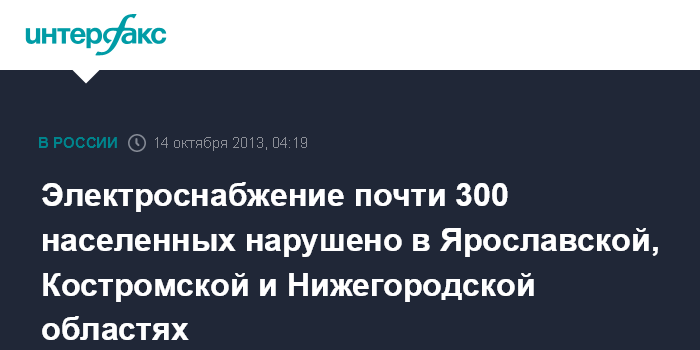 Москва. 14 октября. INTERFAX.RU - Нарушения электроснабжения произошли в ночь на понедельник в ряде населенных пунктов Ярославской, Костромской и Нижегородской областей, сообщает МЧС России.