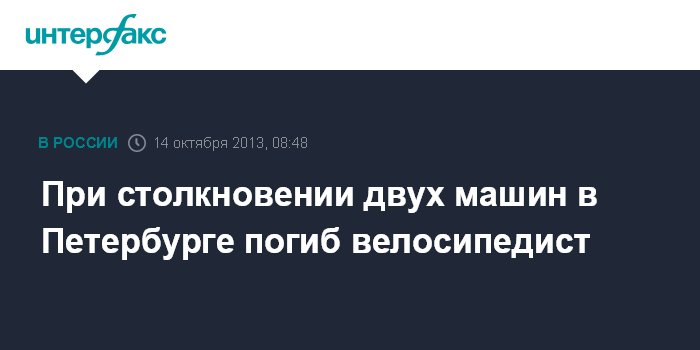 Санкт-Петербург. 14 октября. INTERFAX.RU - В результате столкновения двух легковых автомобилей в Красносельском районе Петербурга погиб велосипедист.
