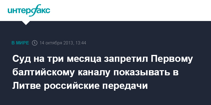 Вильнюс. 14 октября. INTERFAX.RU - Вильнюсский окружной административный суд (ВОАС) в понедельник на три месяца запретил Первому балтийскому каналу (ПБК) показывать программы на территории Литвы, созданные в России и других странах, не являющихся членами Евросоюза (ЕС).