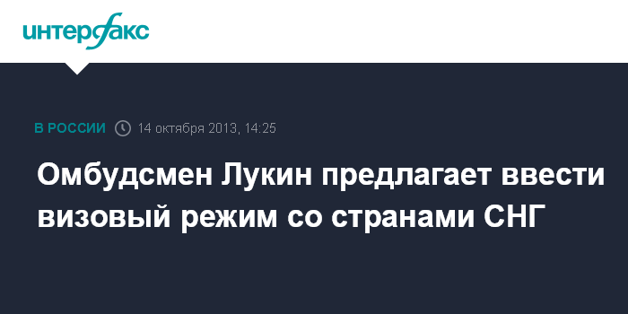 Москва. 14 октября. INTERFAX.RU - Уполномоченный по правам человека в России Владимир Лукин предлагает ввести визовый режим со странами СНГ в рамках мер по борьбе с нелегальной миграцией.