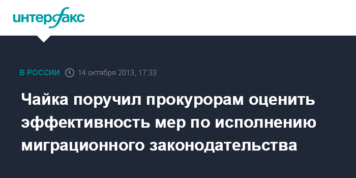 Москва. 14 октября. INTERFAX.RU - Генеральный прокурор России Юрий Чайка поручил подчиненным прокурорам обеспечить надлежащий надзор в сфере исполнения миграционного законодательства, сообщили "Интерфаксу" в пресс-службе ведомства.