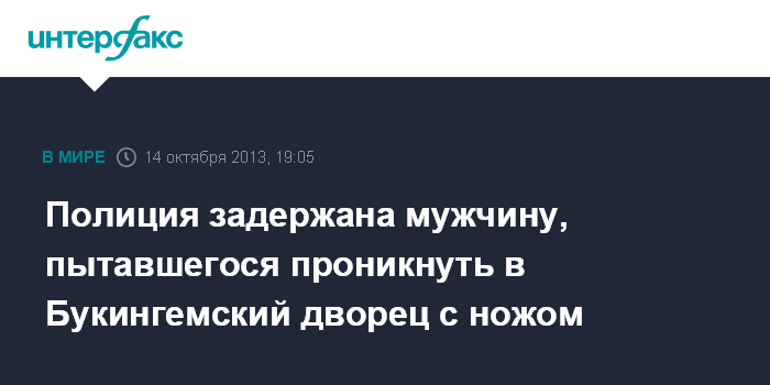 Лондон. 14 октября. INTERFAX.RU - Сотрудники британской полиции задержали мужчину, вооруженного ножом, который пытался проникнуть в Букингемский дворец, сообщают в понедельник в Скотленд-Ярде.