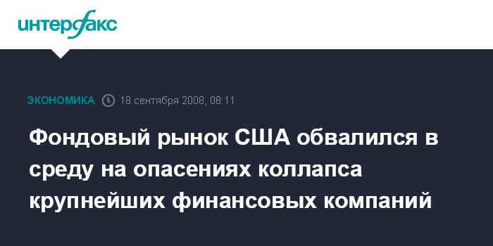 Москва. 18 сентября. INTERFAX.RU - Американские фондовые индексы обвалились по итогам торгов в среду на опасениях коллапса крупнейших финансовых компаний после спасения AIG Федеральной резервной системой (ФРС), сообщает агентство Bloomberg.