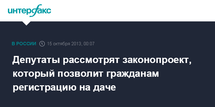 Москва. 15 октября. INTERFAX.RU - Госдума во вторник рассмотрит в первом чтении проект закона, разрешающего гражданам регистрацию по месту жительства в жилом доме, расположенном на садовом или дачном земельном участке.