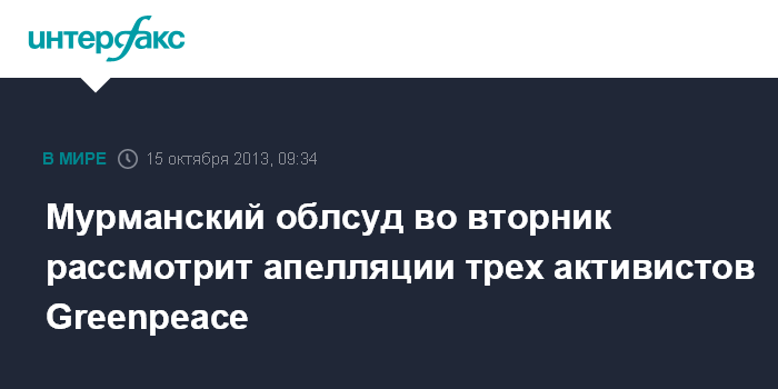 Мурманск. 15 октября. INTERFAX.RU - Мурманский областной суд во вторник начнет рассмотрение апелляционных жалоб защитников еще двух иностранных активистов Greenpeace, а также продолжит заседание по апелляции итальянца Кристиана д'Аллессандро.