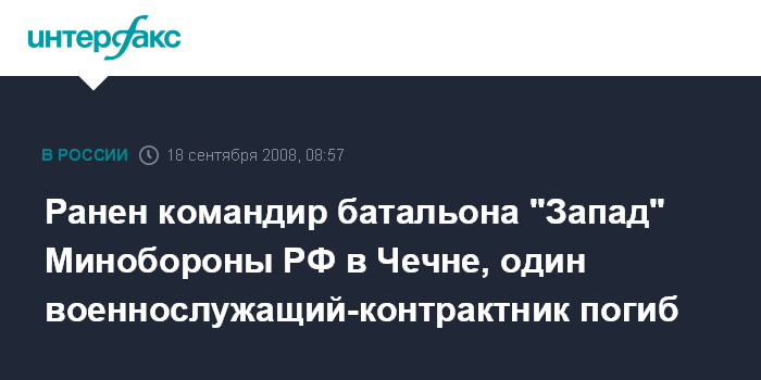 Москва. 18 сентября. INTERFAX.RU - В Чечне в результате обстрела автомашины ранен командир батальона "Запад" Минобороны России, еще один военнослужащий погиб, сообщил "Интерфаксу" источник в правоохранительных органах в четверг.