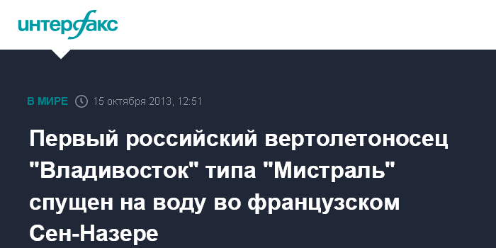 Париж. 15 октября. INTERFAX.RU - В городе Сен-Назер (Франция) началась церемония спуска на воду первого десантного вертолетоносного корабля-дока (ДВКД) "Владивосток" типа "Мистраль", сообщили во вторник "Интерфаксу-АВН" в компании STX France, на верфях которой проходила окончательная сборка корпуса корабля.