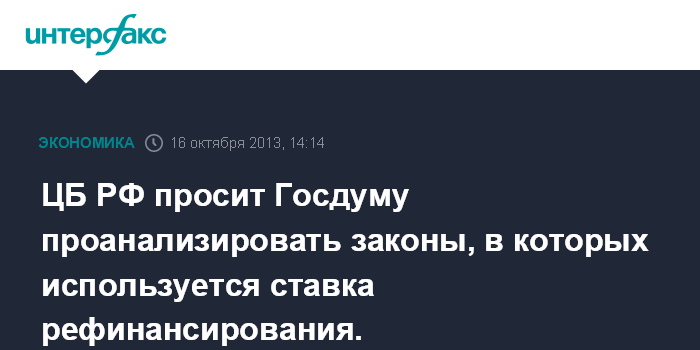 ЦБ РФ просит Госдуму проанализировать законы, в которых используется ставка рефинансирования.