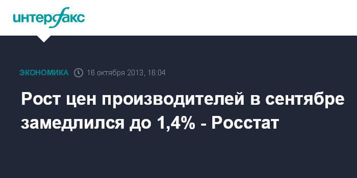 16 октября. FINMARKET.RU - В сентябре 2013 года цены производителей промышленных товаров, по предварительным данным, выросли на 1,4% после роста на 2,8% в августе, сообщает Федеральная служба госстатистики (Росстат). В июле рост составил 2%, в июне - 0,4%, в мае было зафиксировано снижение цен на 1%.