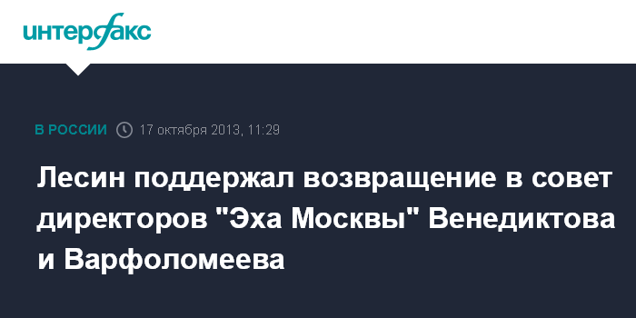 Москва. 17 октября. INTERFAX.RU - Главный редактор "Эха Москвы" Алексей Венедиктов и его заместитель Владимир Варфоломеев вернутся в совет директоров радиостанции.