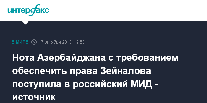 Нота Азербайджана с требованием обеспечить права Зейналова поступила в российский МИД - источник